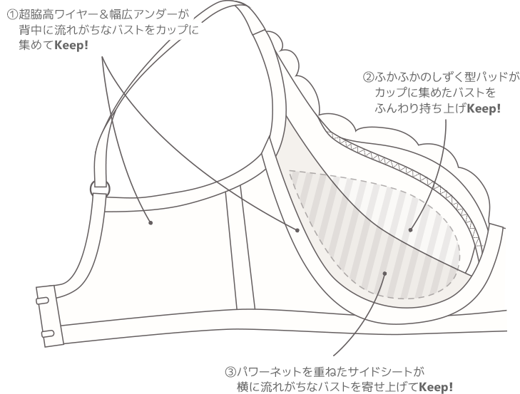脇高設計で、流れやすい脇肉をカップ内に留め、