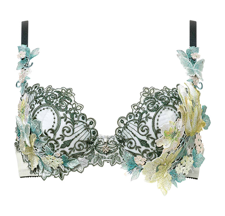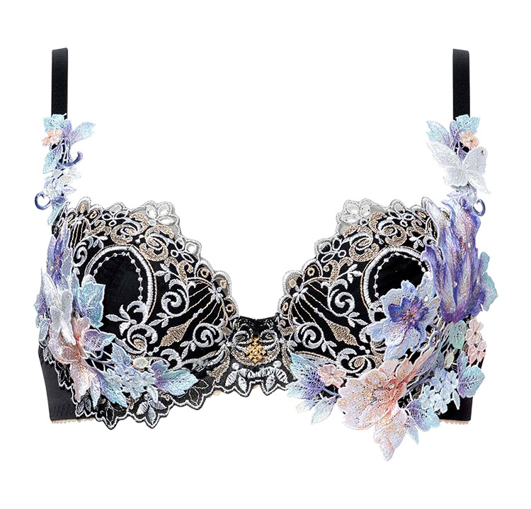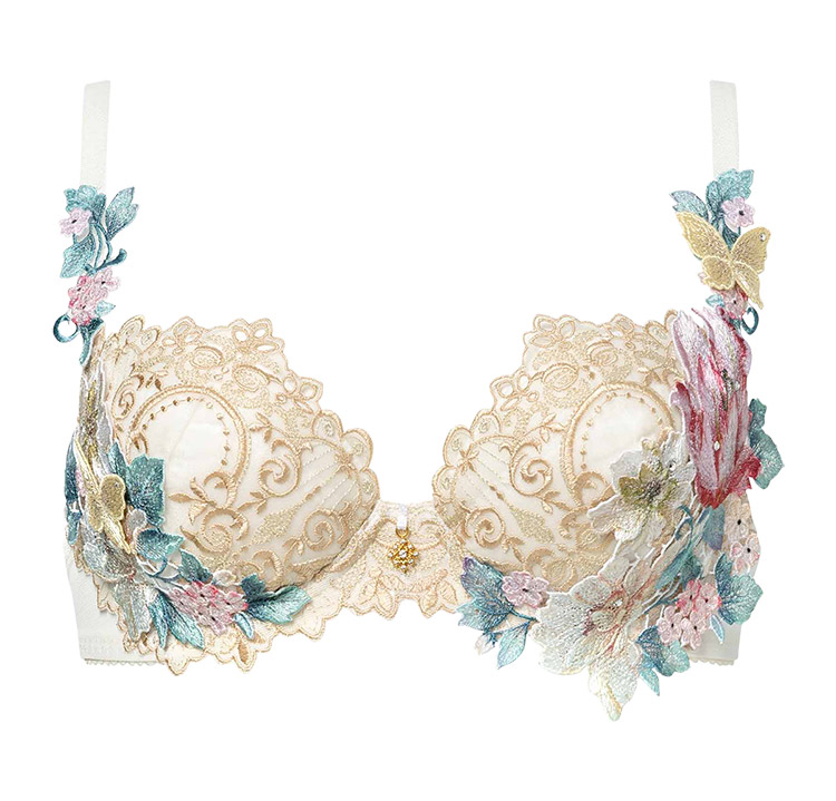 品番:BTJ419 ●くっきりと深い谷間を バストボリュームを脇から中央に寄せ、きれいな谷間をつくるプッシュアップタイプ ・前中心にはスワロフスキー・クリスタルチャーム付き ・カップのレースとアップリケにはラメ糸を使用 ・アップリケには刺繍の柄に合わせたプリントレースを使用(蝶のアップリケをのぞく) ・アップリケにはスワロフスキー・クリスタルを使用(右ストラップをのぞく) ・アップリケはチューリップの花をイメージ <カラー> BL、GY、IV、SX <サイズ> B・Cカップ:¥16,940(税込) D~Fカップ:¥17,820(税込) G~Iカップ:¥18,700(税込) <ホック> 後ろホック B・Cカップ:ホック1段2調節 D~Iカップ:ホック2段2調節 <パッド> なし(パッド受けあり) <ストラップ> 取り外し不可 |