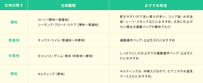 こちらの表を参考にしながら生地を選んでみてくださいね。