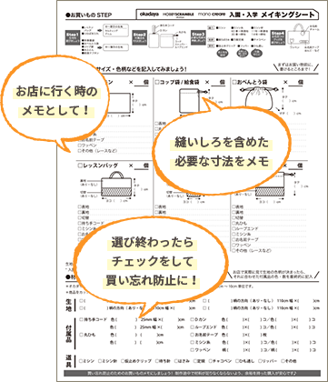 必要なものを記入した「入園入学メイキングシート」を見ながらスムーズに材料選びが出来ます♪