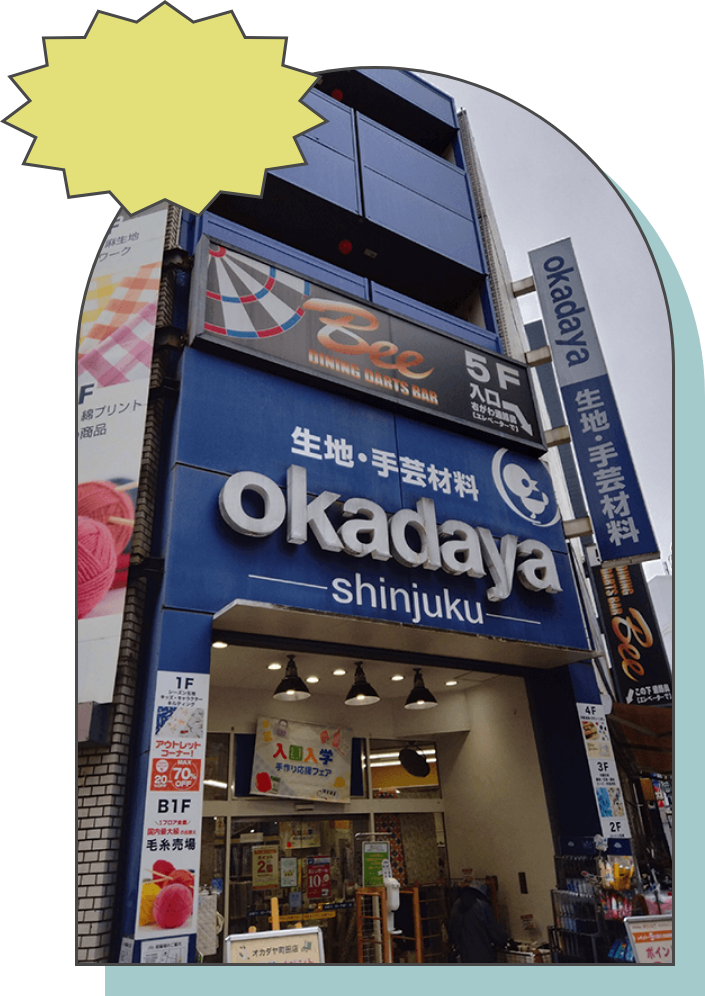 毛糸、編み物用品の他、生地・布、ボタン、リボン、レース、染料、ビーズ、アクセサリーパーツ、ぬいぐるみ材料、メイク用品など多種多様な品揃えを誇る「生地・毛糸・総合服飾手芸材料専門店」です。