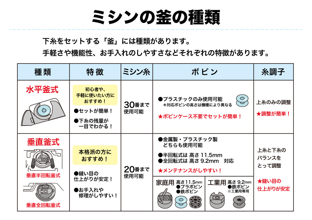 20番糸など太い糸にも対応! 垂直全回転式(ボビンケース仕様) |