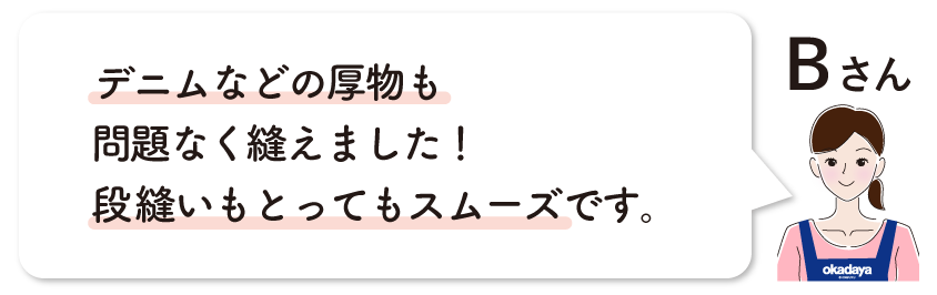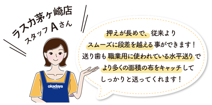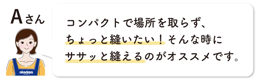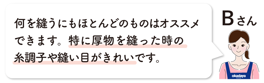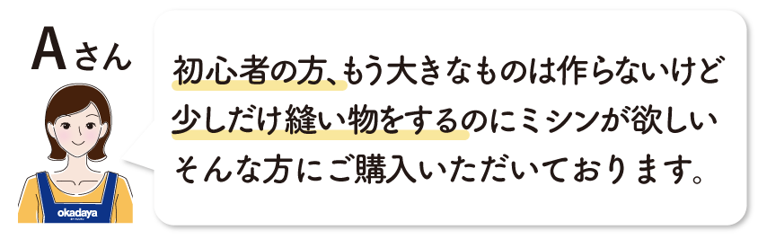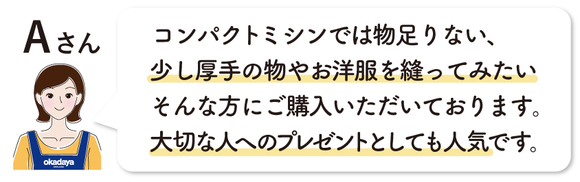 | 用途 | 手軽な趣味程度や洋服縫いなど、用途に合わせて機種の選択が可能 | 内職やショップなど日々使用される方に最適 |