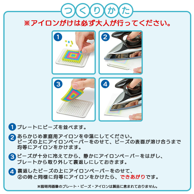 プレートにパーラービーズを置いて、アイロンペーパーを乗せ、アイロンで熱して使用します。