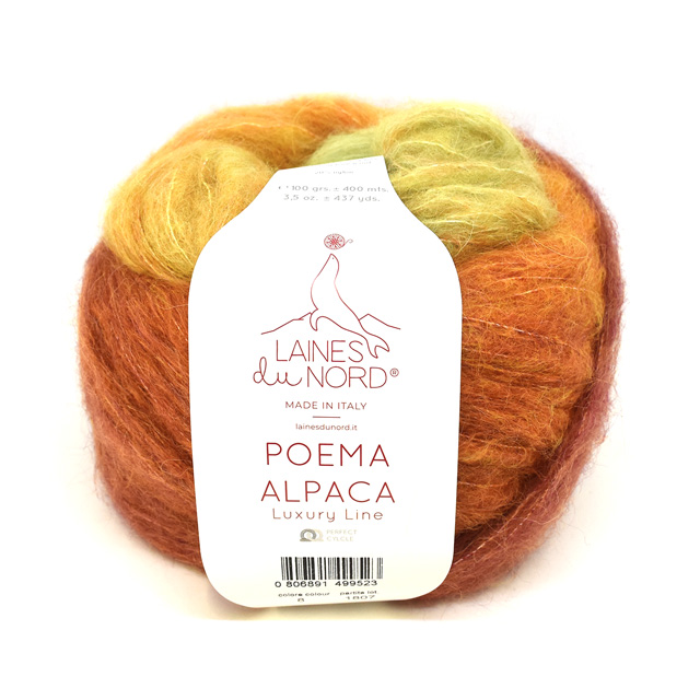 非常に軽くて柔らかく、わずかに毛皮のような効果がある高性能のポエマ アルパカ糸は、帽子や小物はもちろん、アウター、ショールにも適しています。