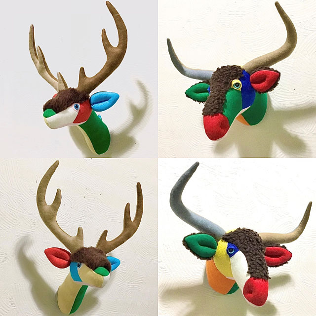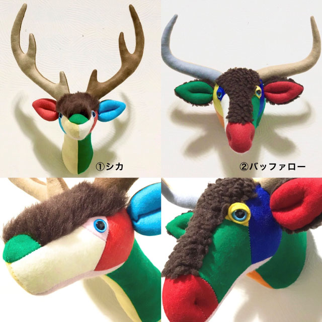 最新作!マルチカラーの可愛い『アニマルトロフィー』作りましょう。 「キット」を使用し、各パーツに手芸わたを詰め、手縫いで仕上げていきます。 後ろにループが付いているので、お部屋の壁飾りとしてご使用出来ます。 ※作るアニマルの種類は「2種類」からご予約時にお選びいただき、キットの配色は当日に選んでいただきます。 ※素材は、カラフルなフェルト、フェイクファー、中綿をメインに使用。 ※通常サイズ(Sサイズ程度)の作品が作れます。 ①シカ(縦約35cm×横25cm×奥行22cm) ②バッファロー(縦約25cm×横30cm×奥行20cm)