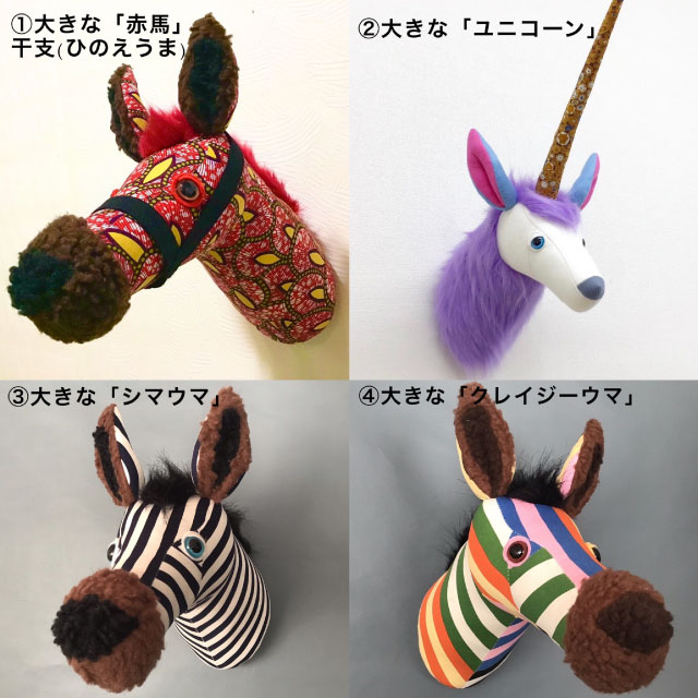 2026年〈干支シリーズ〉大きな『馬』の仲間を作りましょう! 60年に一度巡る干支、赤馬(ひのえうま)の新作も登場。 「キット」を使用し、各パーツに手芸わたを詰め、手縫いで仕上げていきます。 後ろにループが付いているので、お部屋の壁飾りとしてご使用出来ます。 ※作るアニマルの種類は「4種類」からご予約時にお選びいただき、キットの配色は当日に選んでいただきます。 ※素材は、プリントファブリック、フェイクファー、フェルト、中綿をメインに使用。 ※大きなサイズ(Mサイズ程度)の作品が作れます。 ①大きな「赤馬」〈ひのえうま〉(縦約35cm×横20cm×奥行40cm) ②大きな「ユニコーン」(縦約55cm×横20cm×奥行30cm) ③大きな「シマウマ」(縦約35cm×横20cm×奥行40cm) ④大きな「クレイジーウマ」(縦約35cm×横20cm×奥行40cm)