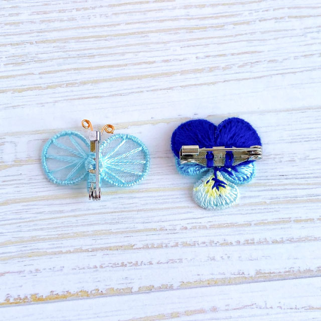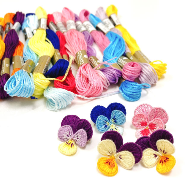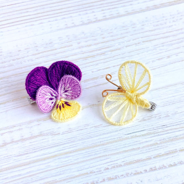 ワイヤーを縫い込んで立体に仕上げることができるスタンプワークの技法を使って、小さなパンジーとちょうちょのブローチを作ります。 図案写しから布の張り方、ワイヤーワーク、裏面も美しいステッチ、立体刺繍の仕上げまでの工程を全て学べます。 パンジーのカラー、ちょうちょのカラーは当日お好みの糸をお選びいただけます。 大きさは2.5cm程度。