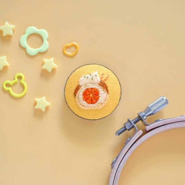 オレンジロールケーキのモチーフを刺繍し、ブローチに仕立てます。 刺繍初心者さんでも対面で詳しくお教えしますので安心して参加していただけます。 手刺繍の基本的なステッチが学べて他のモチーフにも応用できます! 仕上がりサイズは3cm×3cmです