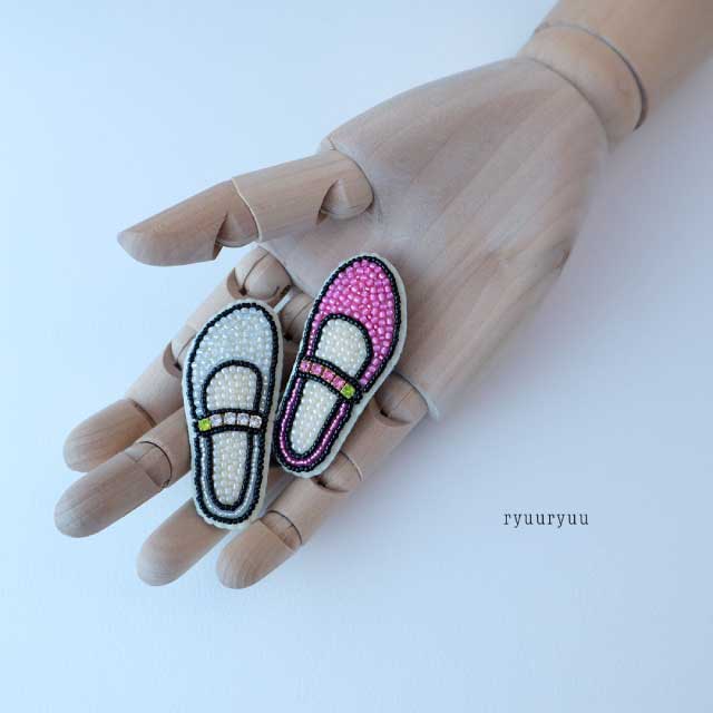 ストラップシューズモチーフのブローチです。 左右どちらか片方のブローチを1点作ります。 あらかじめ図案がプリントされた布に刺繍をしていただきます。 ワークショップでは見本以外のお色を選んでいただくこともできます。 (選べる色は当日のお楽しみです。) 手刺繍によるビーズの縫い方などが学べます。 ブローチに仕立てる縫い方も学べます。 (流流独自の手法が含まれることもあります) サイズ:縦:約6cm 横:約2.5cm