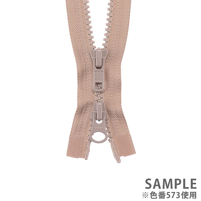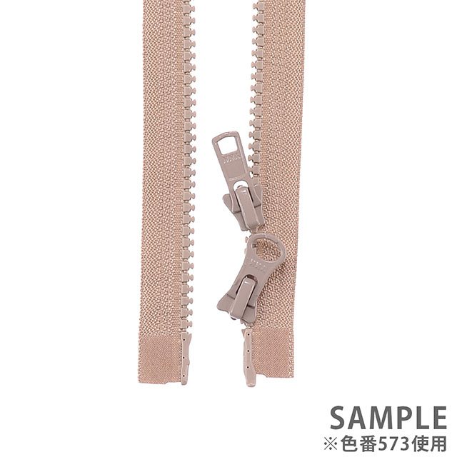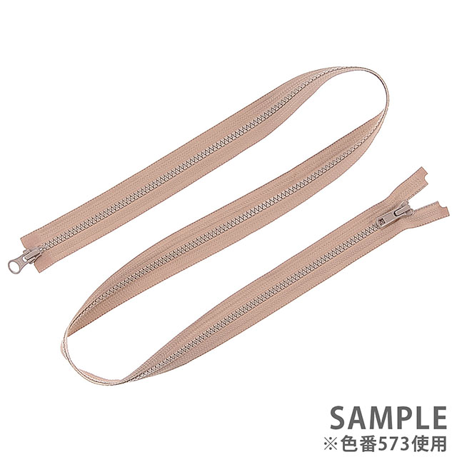 エレメントが樹脂でできている逆開オープンファスナーです。同サイズの金属ファスナーに比べ軽量です。