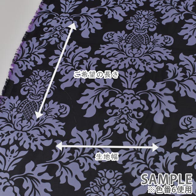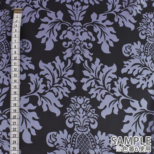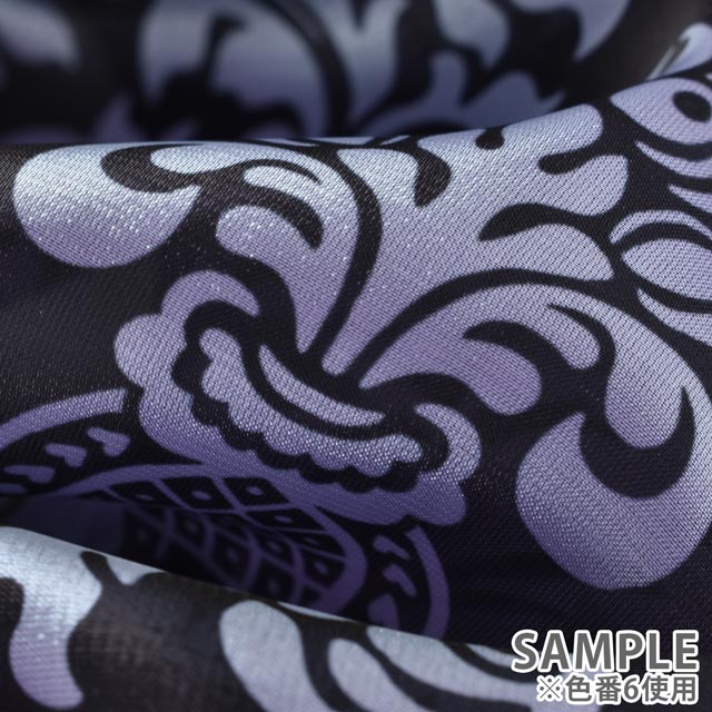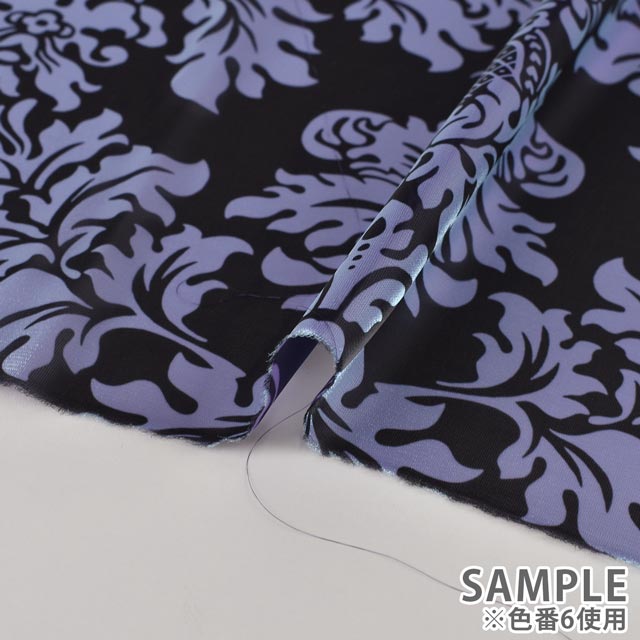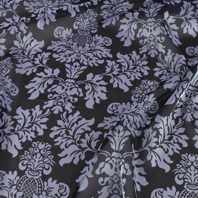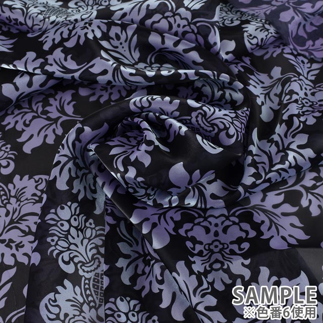 光沢感のあるオーガンジーにダマスク模様をプリントした、クラシックなポリエステル生地です。