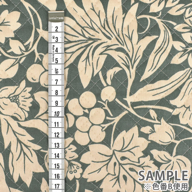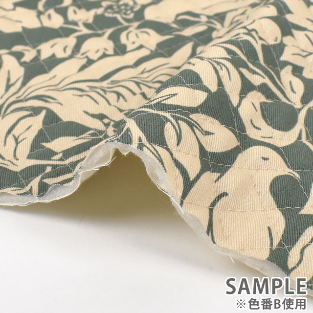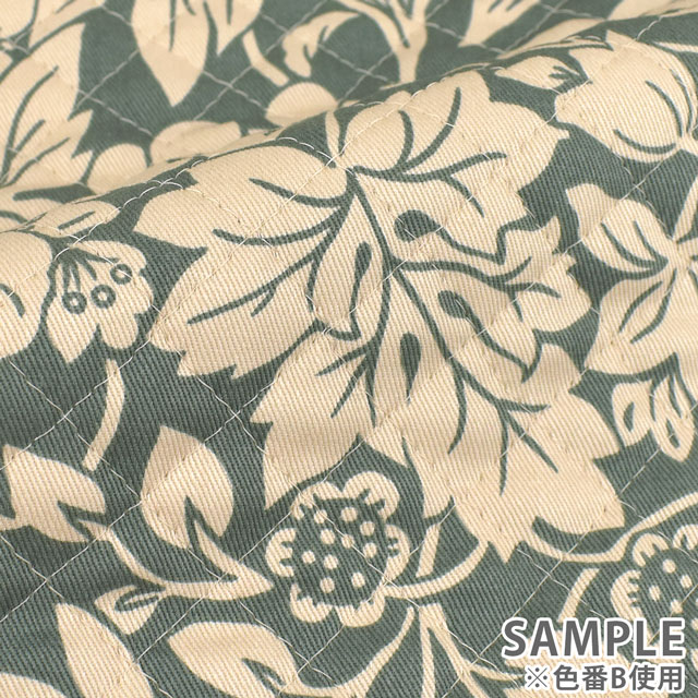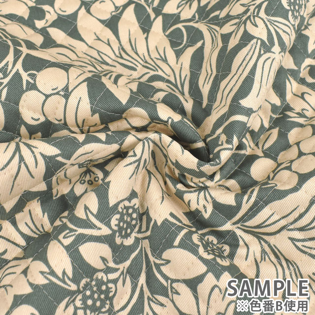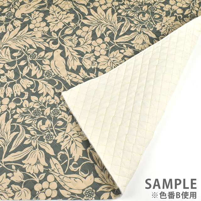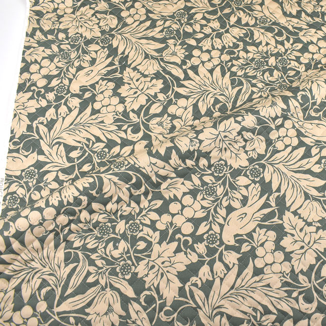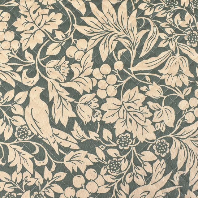 表布に程よい厚みのあるツイル生地を使用し、大人っぽく落ち着いた雰囲気のお花・木の実・小鳥がプリントされたキルト生地です。