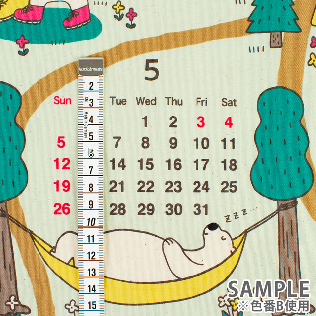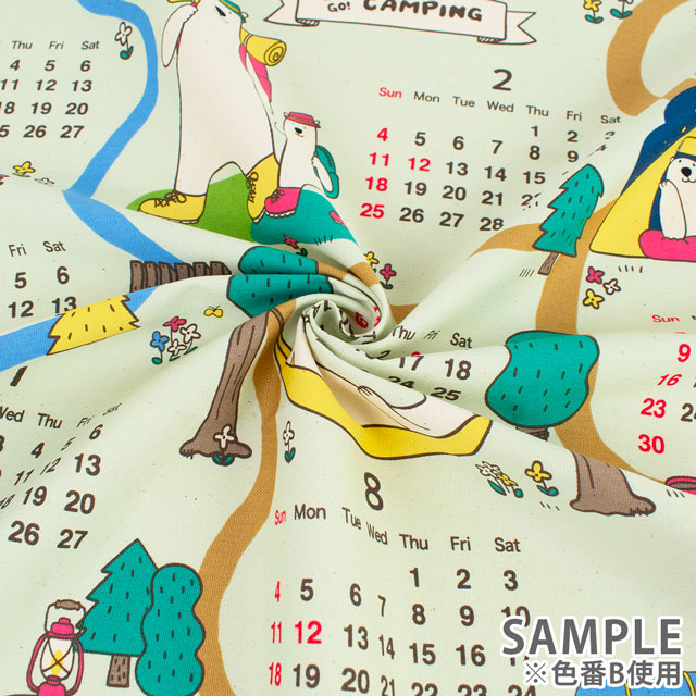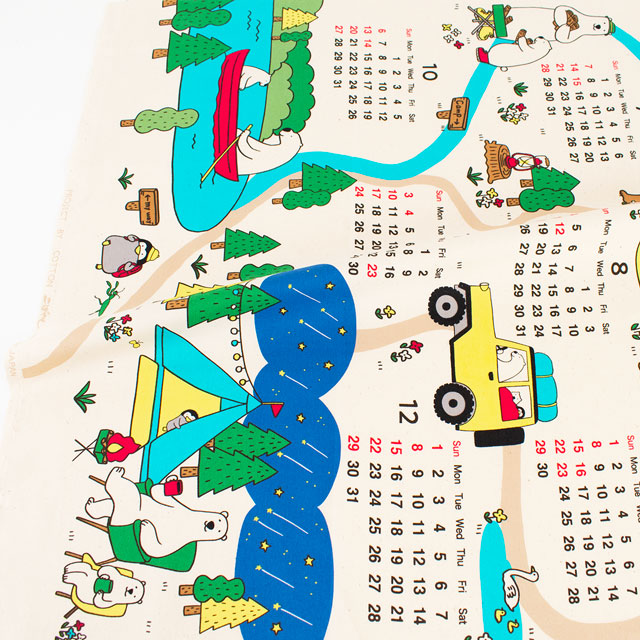 キャンプに出掛けるクマの親子がデザインされたカレンダーパネル生地です。