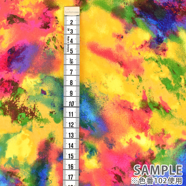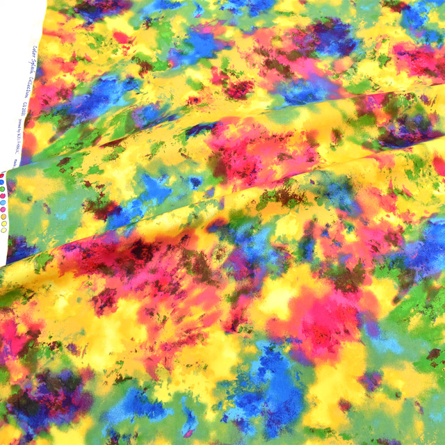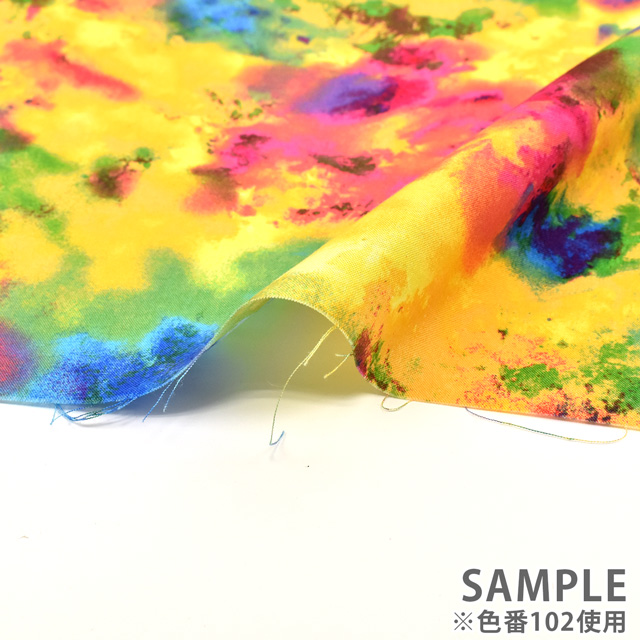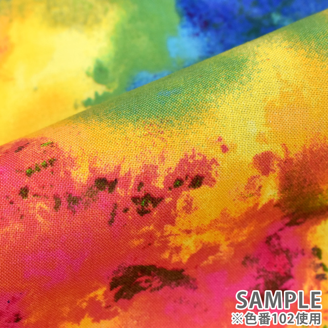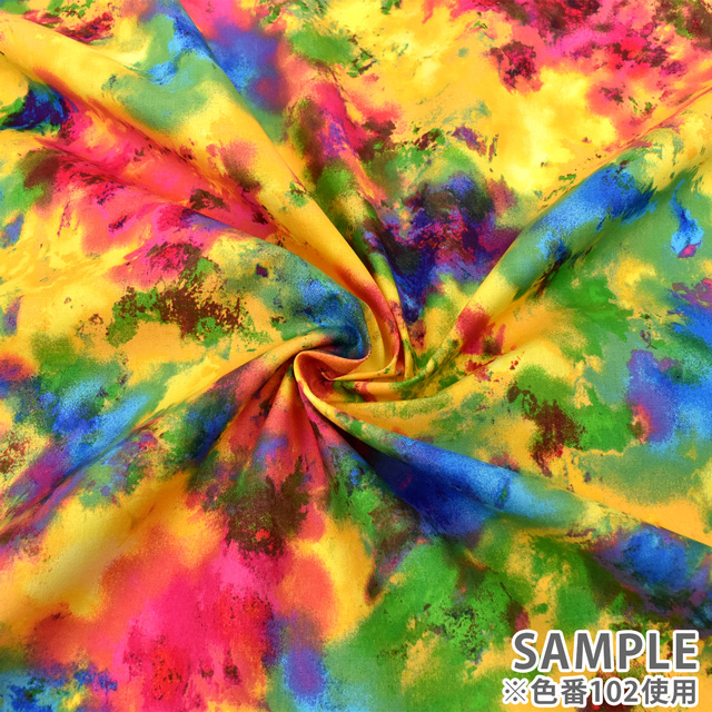 鮮やかでエキゾチックなムラ染め柄のプリント生地です。