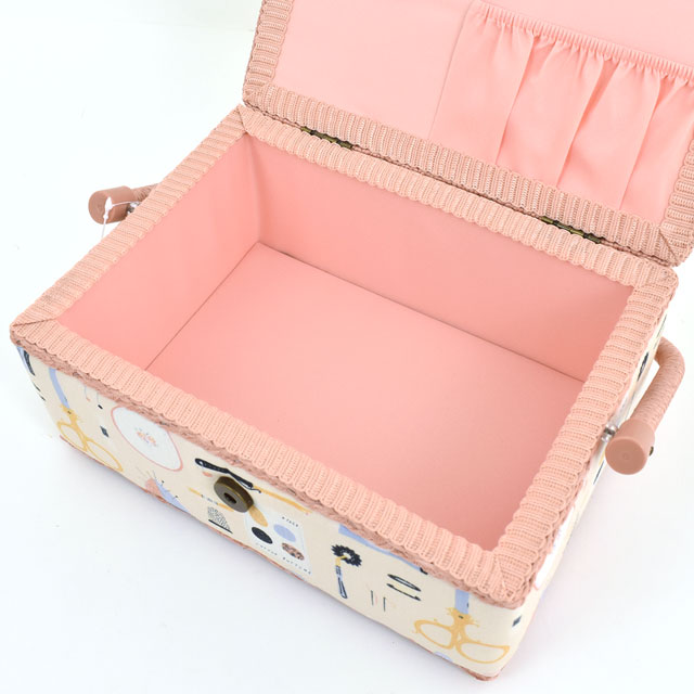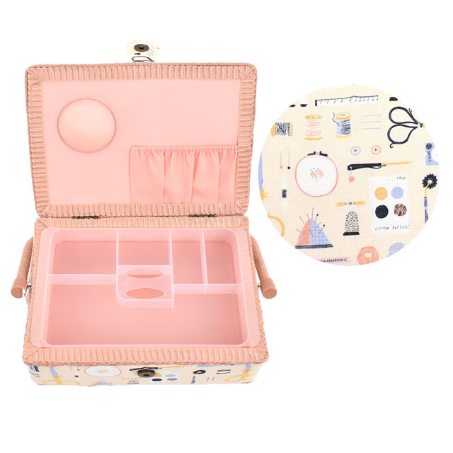 オカダヤ別注・数量限定販売!ディアステラのプリントファブリックを使ったソーイングボックス。ピンクッション・ギャザーポケット・半透明の仕切りケースがついています。