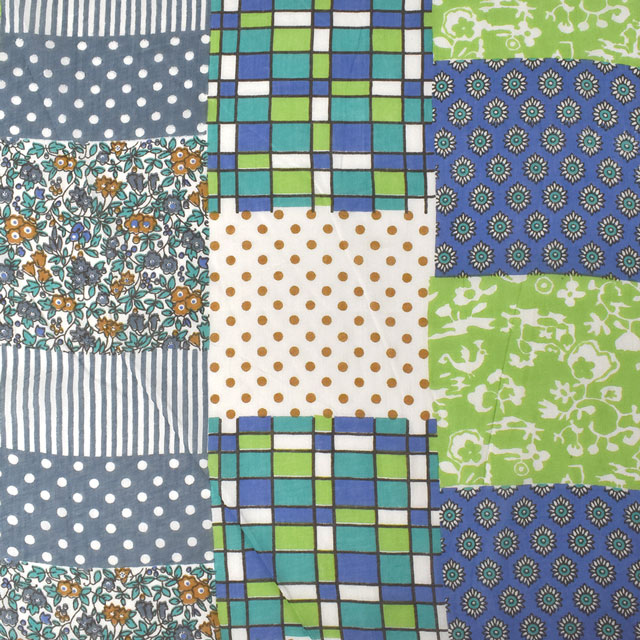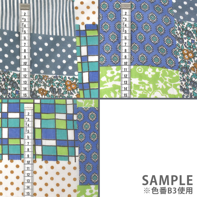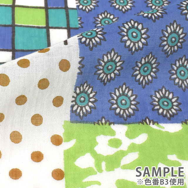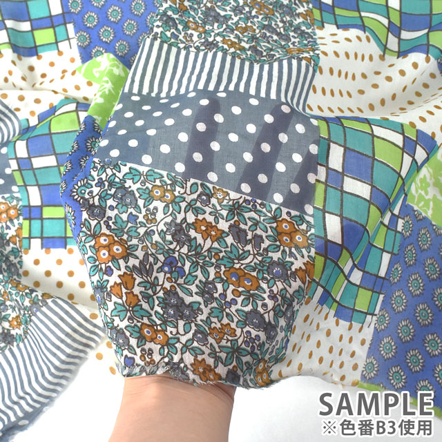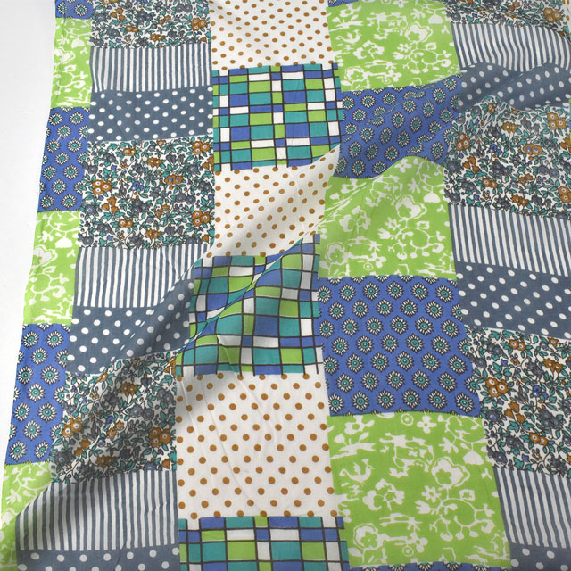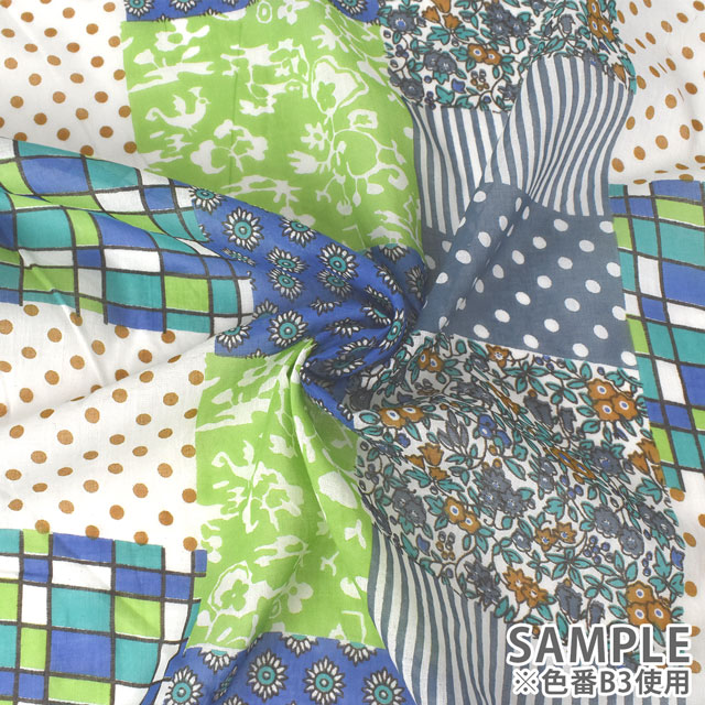 水玉やチェック・花柄・小紋柄などが組み合わされたパッチワーク調のデザインです。