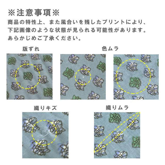 商品の特性上、織りキズや織りムラが入ることがあります。また、風合いを残したプリントにより版ずれ・色ムラがある可能性があります。あらかじめご了承ください。