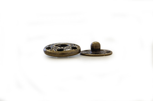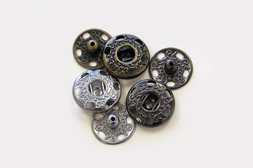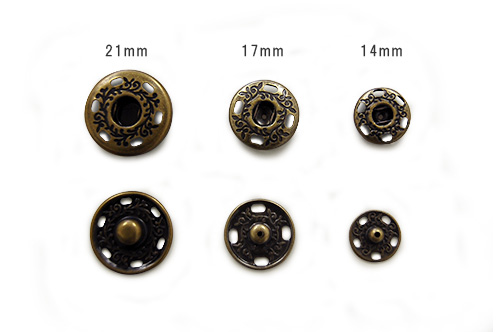 スナップ全面に刻印を施し、デザイン性を高めた縫い付けタイプのスナップボタンです。