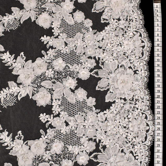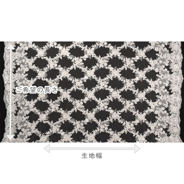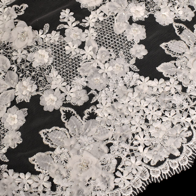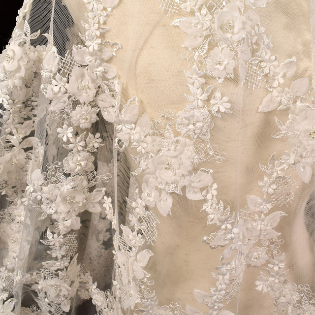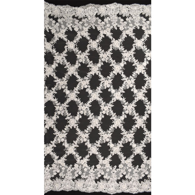 生地全面がビーズ、パール、花と葉のモチーフ、刺繍によって大きな格子柄になっているレースです。