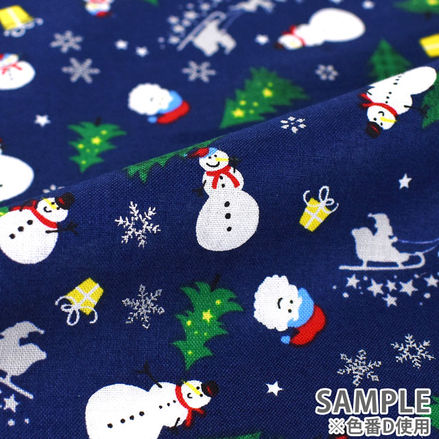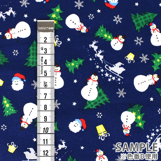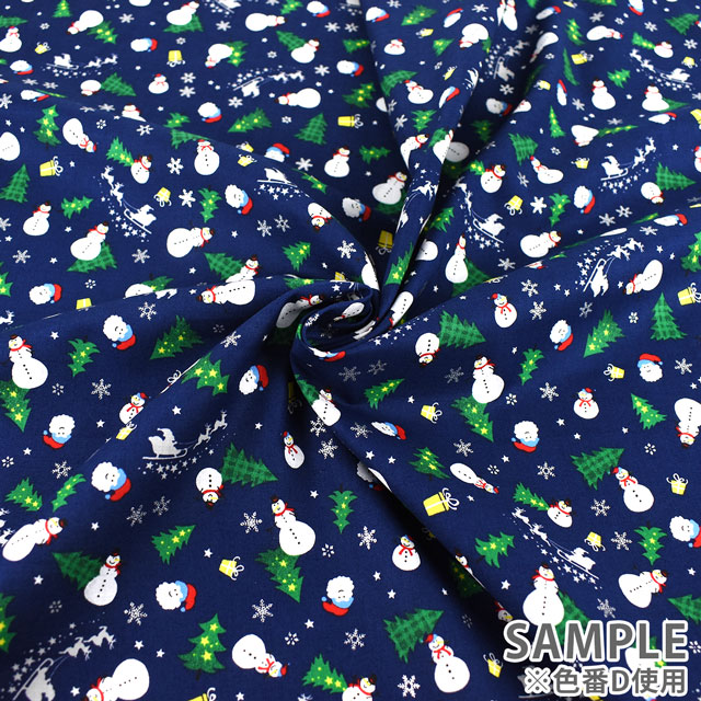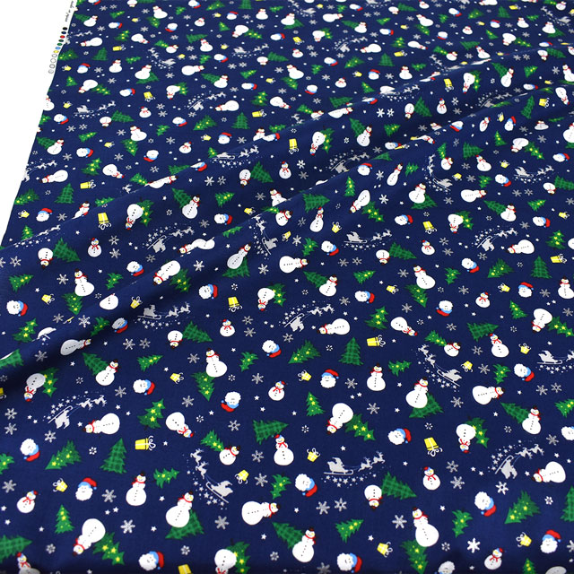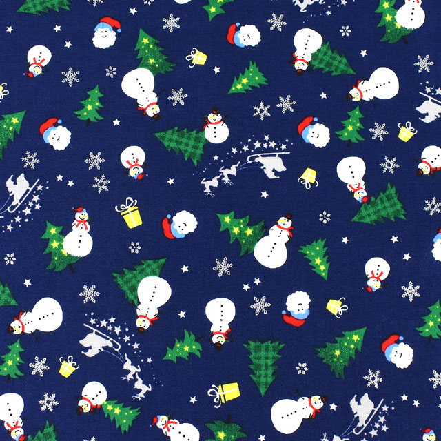 雪だるまやクリスマスツリー、サンタなどのクリスマスモチーフがデザインされたプリント生地です。