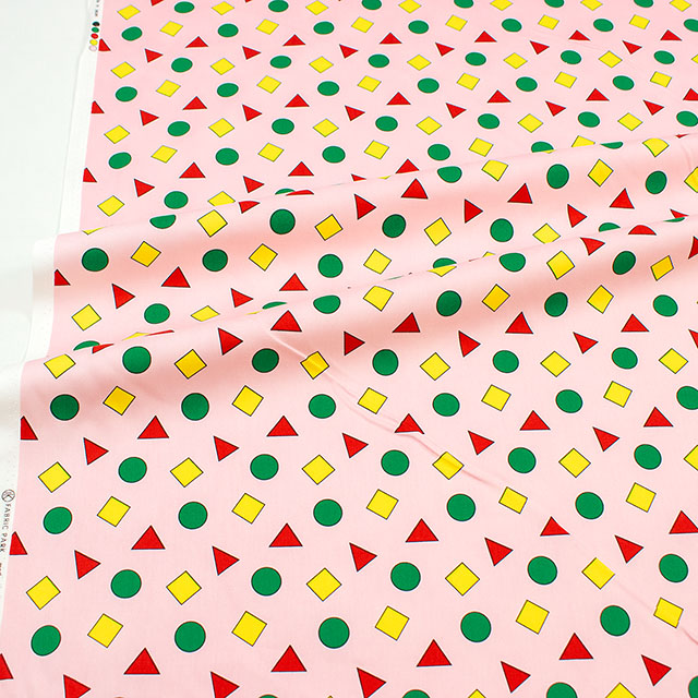 カラフルな配色の「まる・さんかく・しかく」柄の生地です。