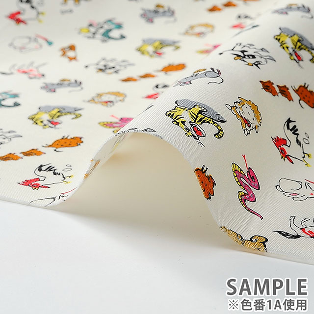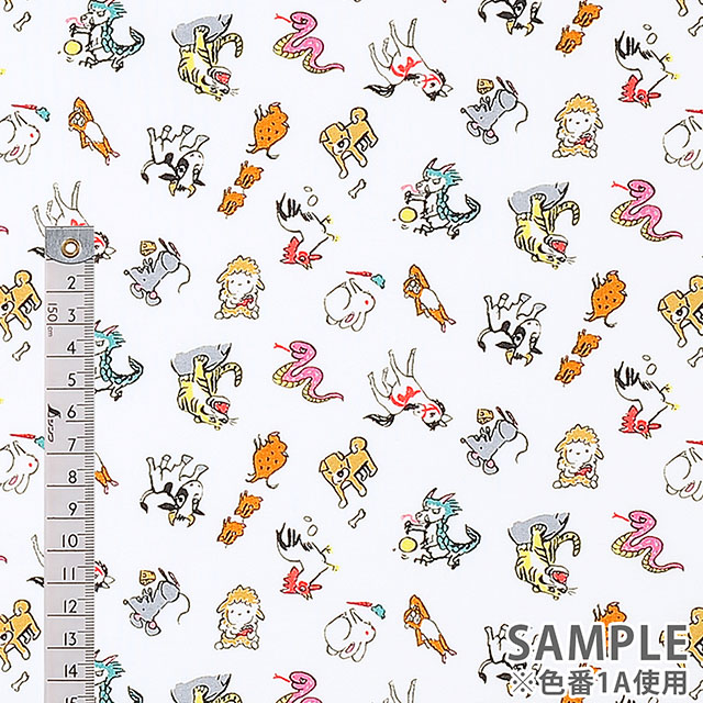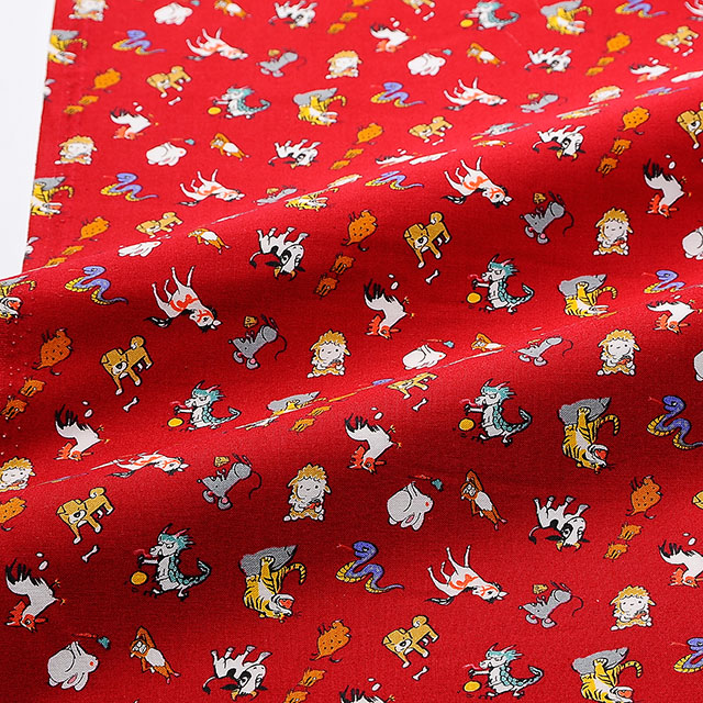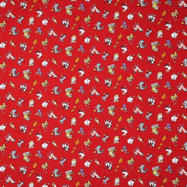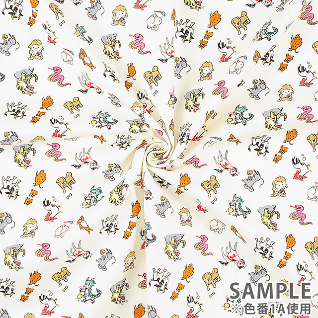 縁起の良い十二支が描かれた八百万(やおよろず)柄のプリント生地です。