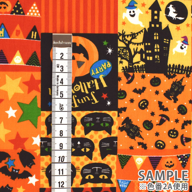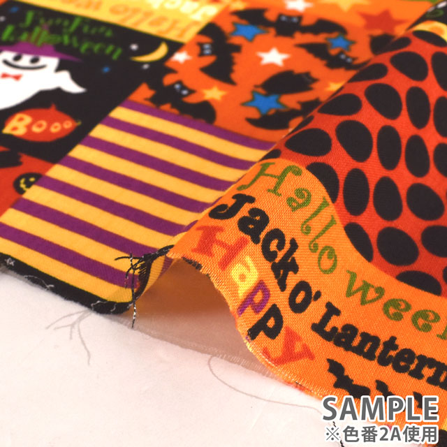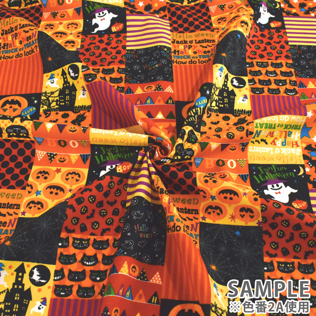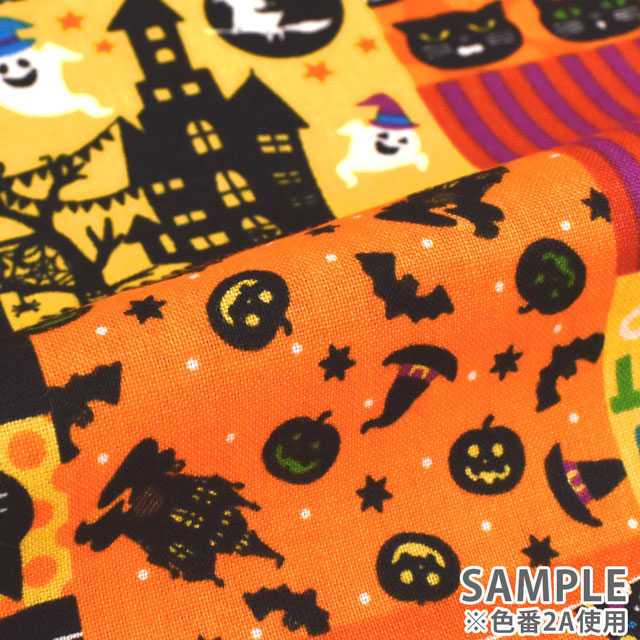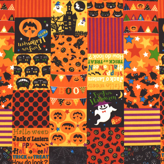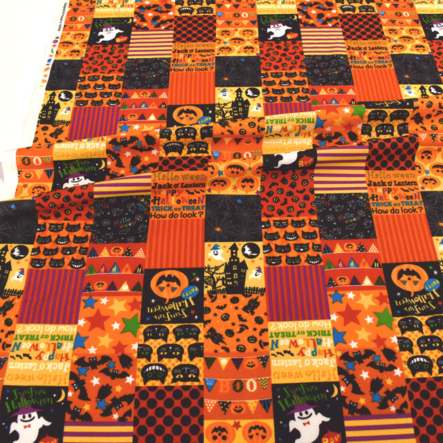 おばけや黒猫、コウモリ、ジャック・オ・ランタンといった、ハロウィン定番の柄がパッチワークのようにデザインされたプリント生地です。