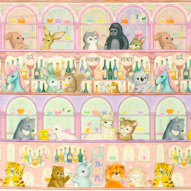 カウンターに並ぶのはうさぎ、ひつじ、ねこ、そしてゴリラ。カクテルを飲みながらどんな話をしているのでしょう。