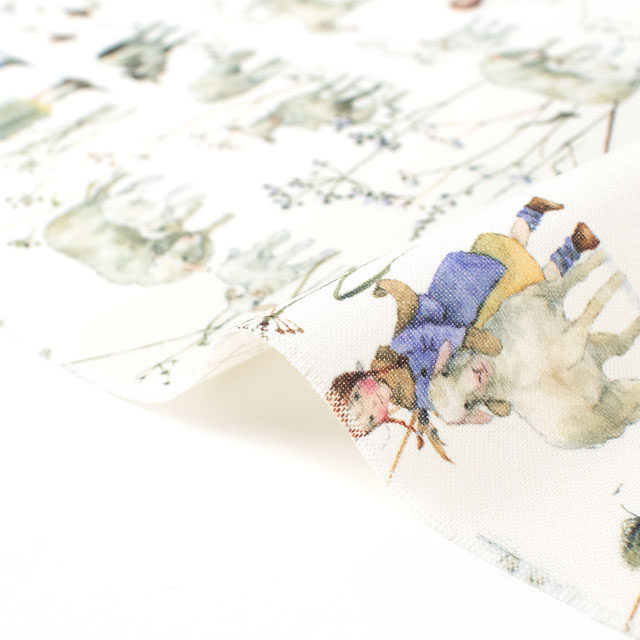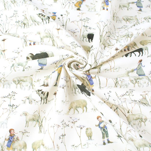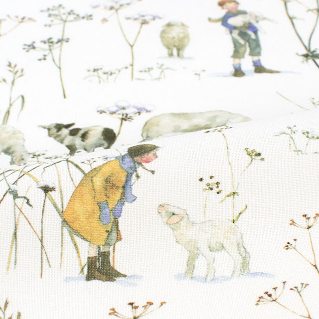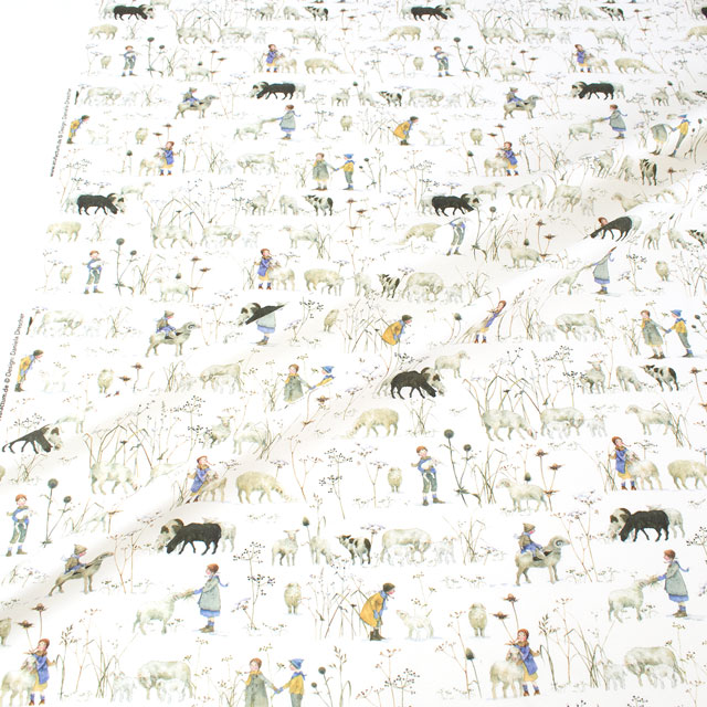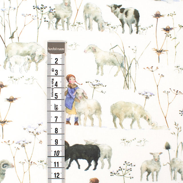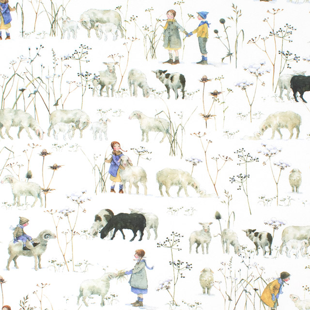 羊と子供たちがいる牧草地の冬の雰囲気がこの生地からもうすでに感じられます。手つかずのおとぎ話のような自然の中での人間と動物の愛情あふれる出会いは私たちの心を打つものです。
