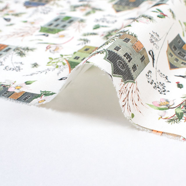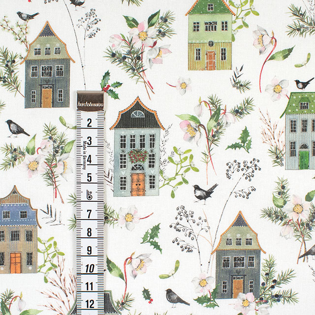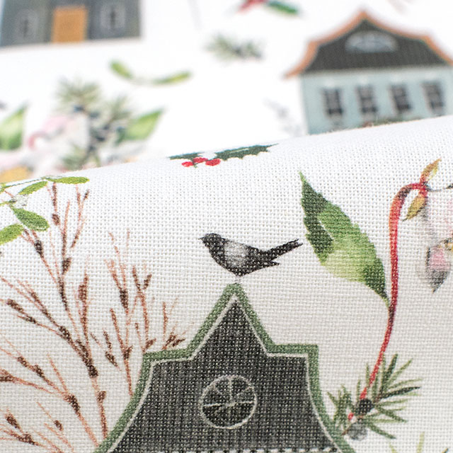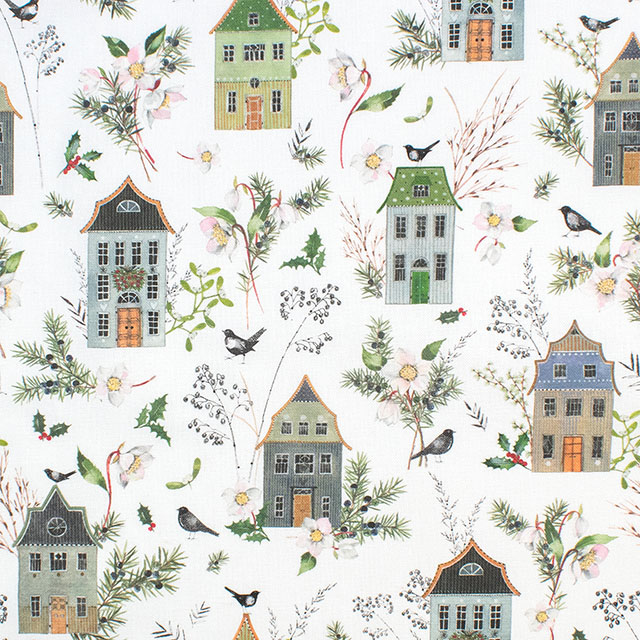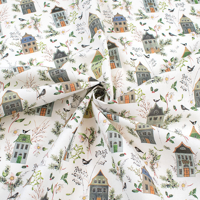 冬の緑と繊細なクリスマスローズに囲まれた家々の詳細な描写は、あなたを魔法とファンタジーに満ちた世界に浸らせます。この生地を一目見るたびに、自然の美しさと家の居心地の良さが中心となる冬の牧歌的な世界にあなたを連れていきます。