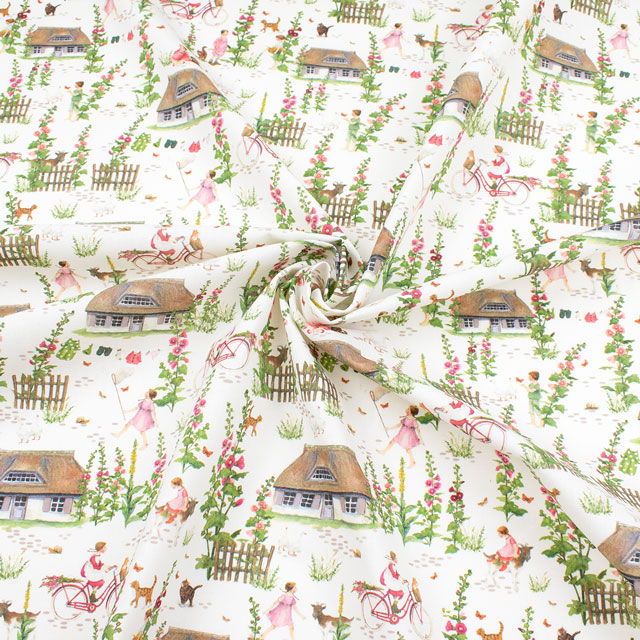 海沿いのどこかのどかな夏の村が描かれています。遊んでいる女の子や男の子が風景の中を駆け抜け、物干し竿がさわやかな風に揺れています。子猫、ヤギ、ガチョウ、蝶が田舎の生活を豊かにしてくれています。咲き誇る葵と居心地の良い茅葺きの家が心地よい雰囲気を醸し出しています。この夏の村では、どんな美しい物語が繰り広げられるのでしょうか?