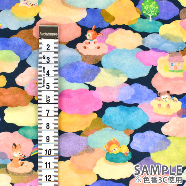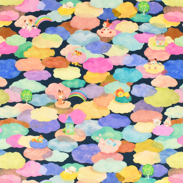 カラフルな雲の中で、動物たちが思い思いに過ごしている可愛らしいデザインです。