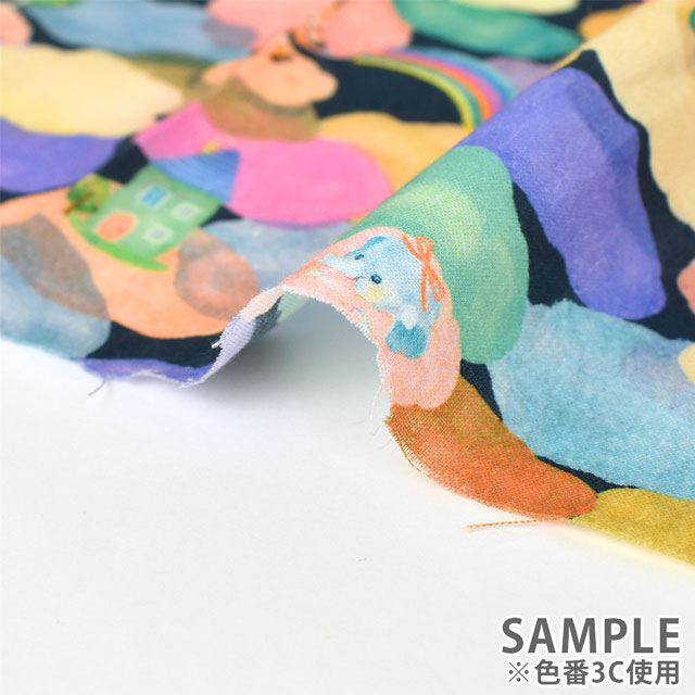 デジタルプリントで表現されたファンタジックな柄とカラフルな色使いが特徴的です。