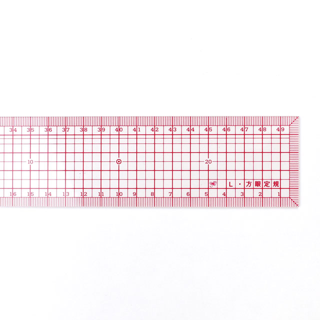 L尺、方眼定規、分度器、ボタンホール作図用穴の機能を持たせた多機能定規です。
