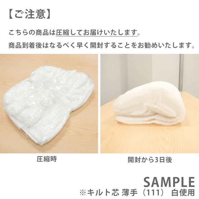 お品物が届きましたら、できるだけお早めに袋から取り出してください。(圧縮した状態で長期間放置しますと、折シワや膨らみが戻りにくくなる場合があります。)