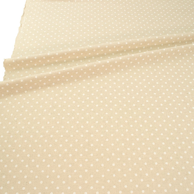 ナチュラルな風合いでしっかりとした綿麻のキャンバス地に定番の水玉柄がプリントされた生地です。