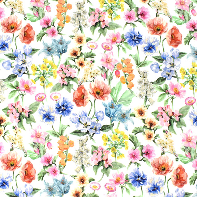 リンゴの花、オダマキ、キバナノクリンザクラ、ブルーベル、ダブルデイジー、マツヨイグサ、ワスレナグサ、ヘレボルス、アイスランドポピー、ジャスミン、スズラン、ゼニアオイ、パンジーなどの草原に咲く花々が描かれています。
