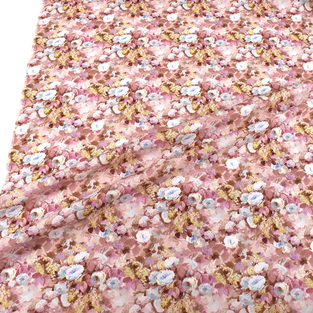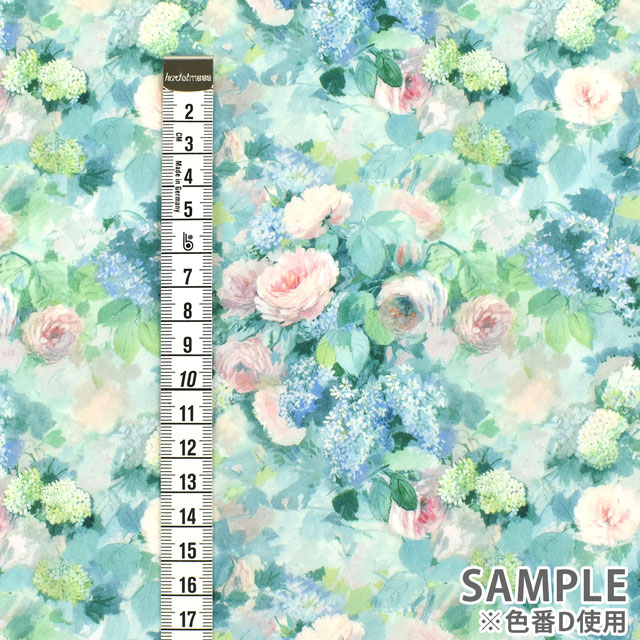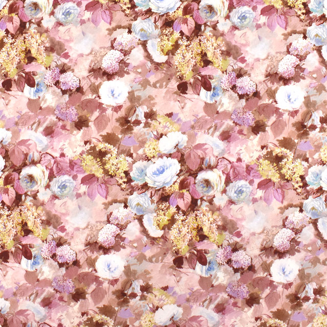 リバティアーカイブの手描き作品を再構成したデザインで、紫陽花・ライラック・バラの花束が滝のように流れ落ちるロマンチックな花柄です。
