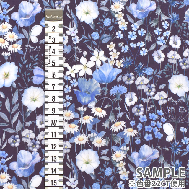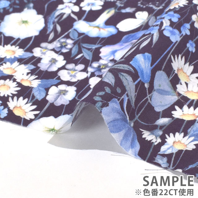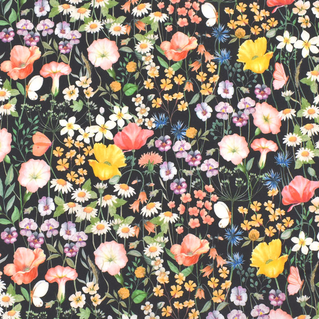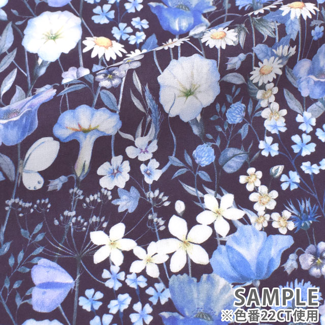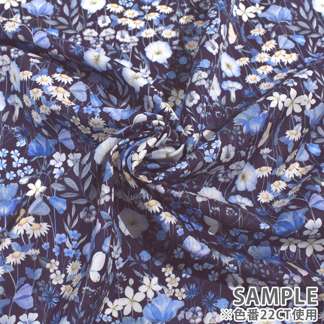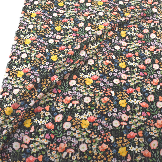 繊細な草原の風景の中に絡み合う葉と咲き誇る花が融合し、典型的なリバティのフラワーデザインを彷彿とさせます。