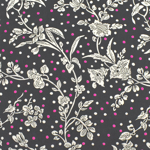 モノクロで描かれた東洋の花を斑点の柄の上にレイアウトされた柄へとアレンジされました。
