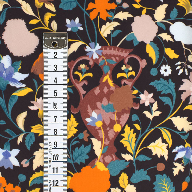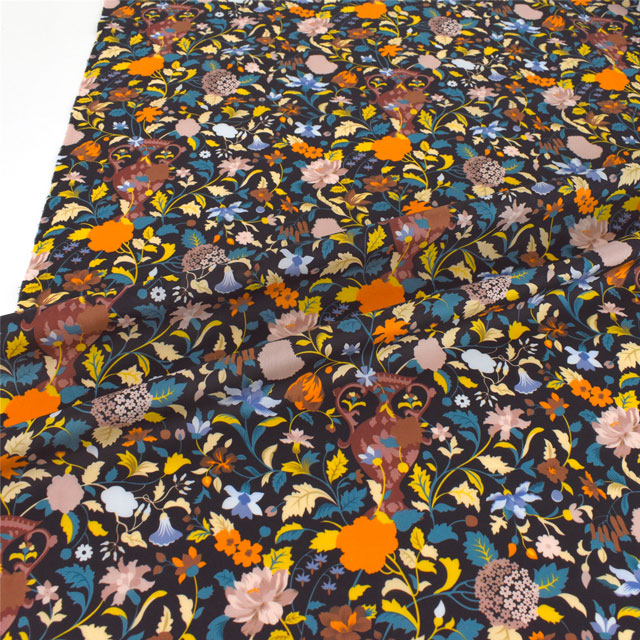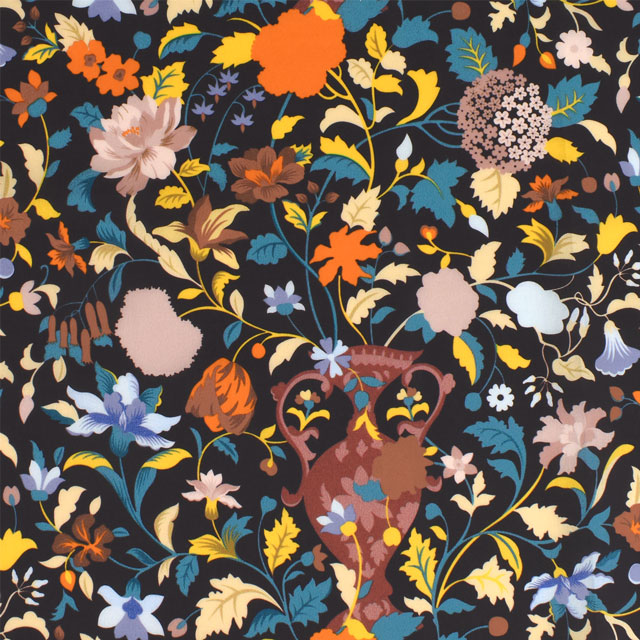 リバティアーカイブのデザインをベースに、アドニスの象徴であるアネモネ、マリーゴールド、ペチュニア、シャクヤクなどの様式化された植物が花瓶にレイアウトされ、茎がうねるようなデザインが動きとダイナミズムを表現しています。