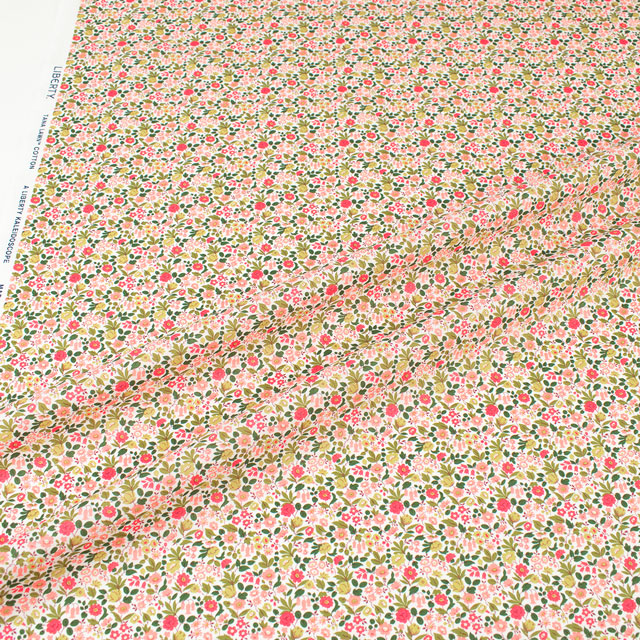 1965年にリバティのために初めて作られ、プリントされたこのデザインは、ブルーベルのイラストが魅力的だったので、アーカイブの中から選ばれました。ミニチュアのベリー、葉、バラ、チューリップ、ヒナギク、アサガオの花が密集し、まるで布の上に散りばめられた宝石の輝きのようです。