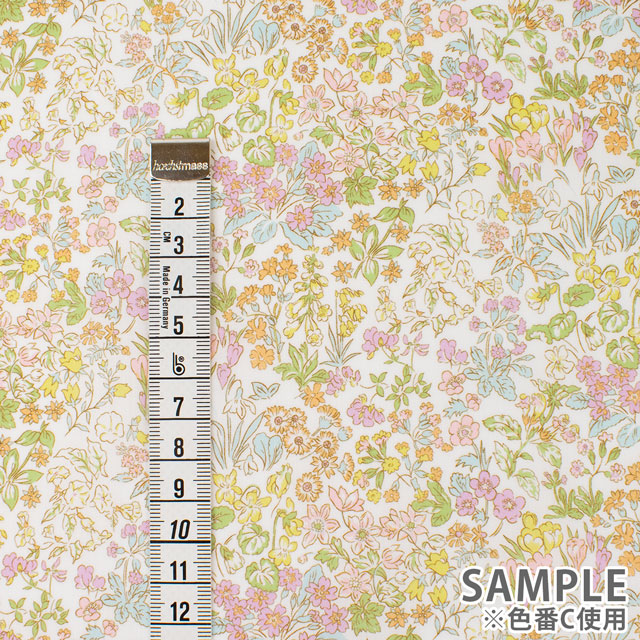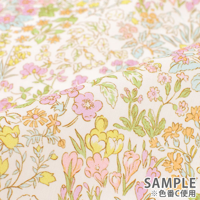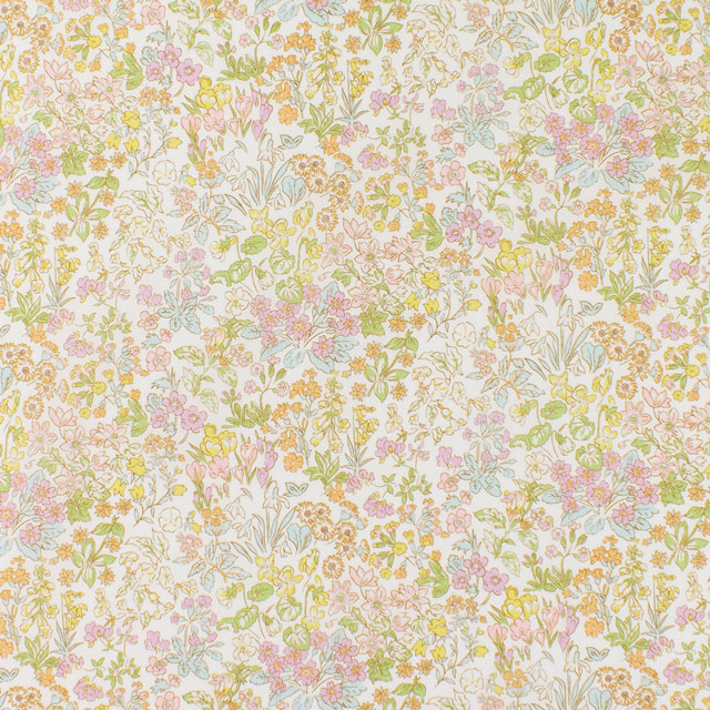 デイジー、パンジー、スノードロップ、クロッカス、キンポウゲが、リバティの真骨頂である繊細なアウトラインで描かれたボタニカルスタイルの緻密なパターンを作り出しています。