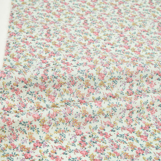 1977年のリバティプリントからインスパイアされ、ミニチュアの枝、群生するバラ、開花したつぼみななどの繊細なディテールが楽しいディッツィ・フローラルです。