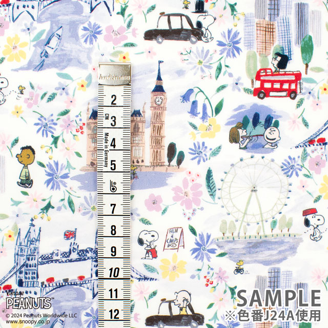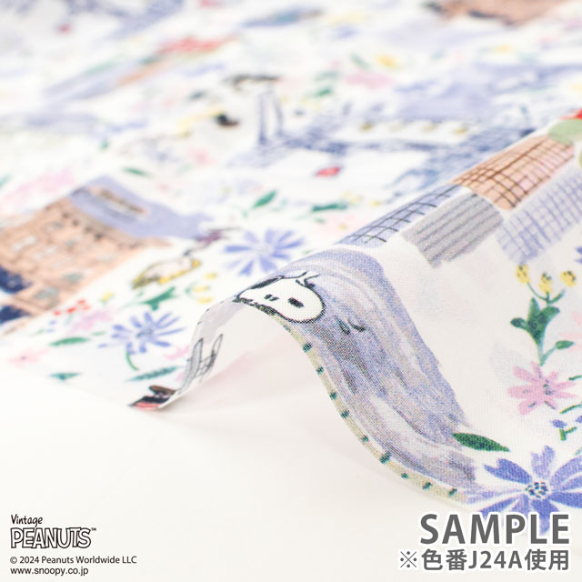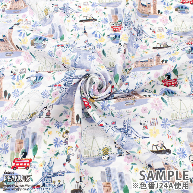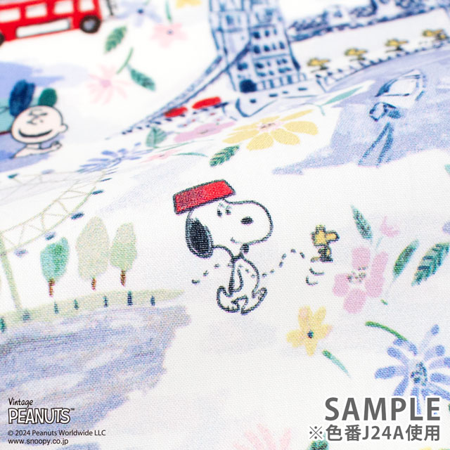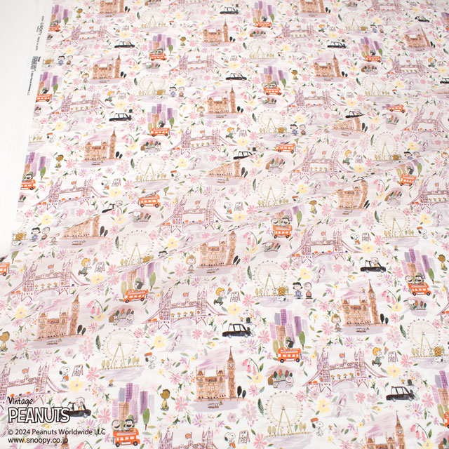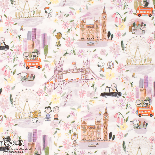 リバティ・ファブリックスのスタジオで愛情を込めて手描きされた気まぐれな絵はがきのようなパターンに、ピーナッツのなかまたちが溶け込んでいます。