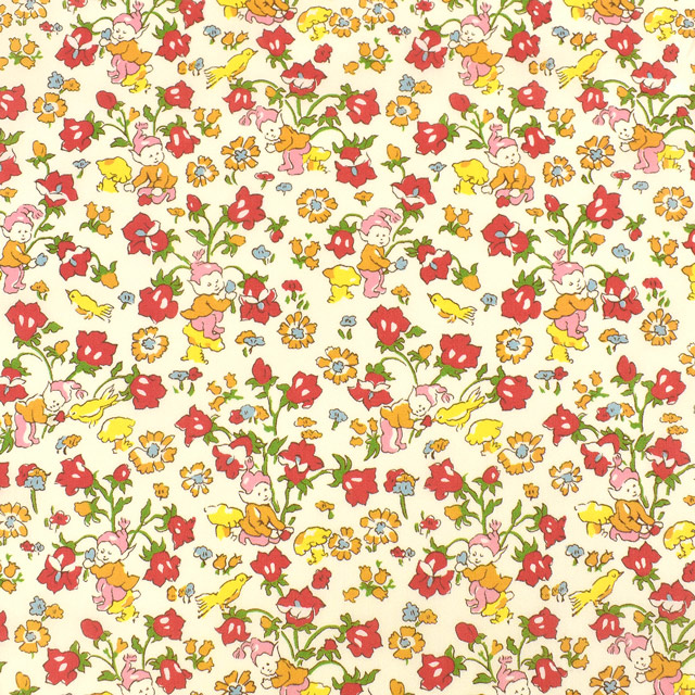 絵本のワンシーンを思い起こさせるこの遊び心あふれる柄には、いたずら好きな妖精や 小鳥たちが隠れています。