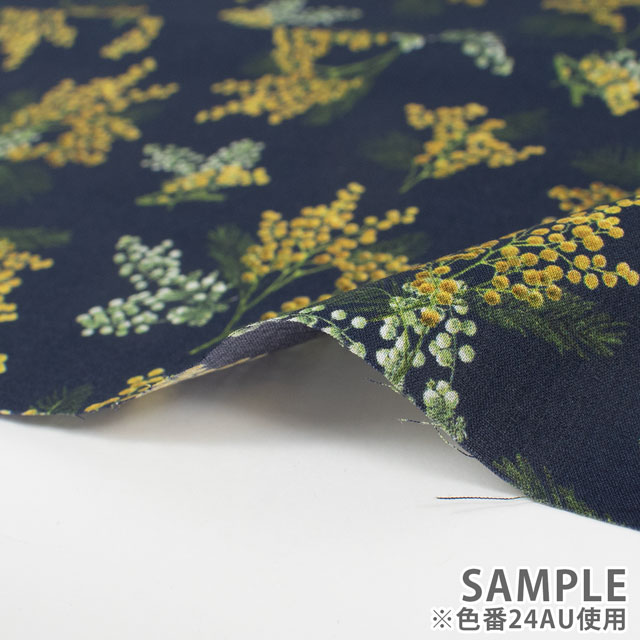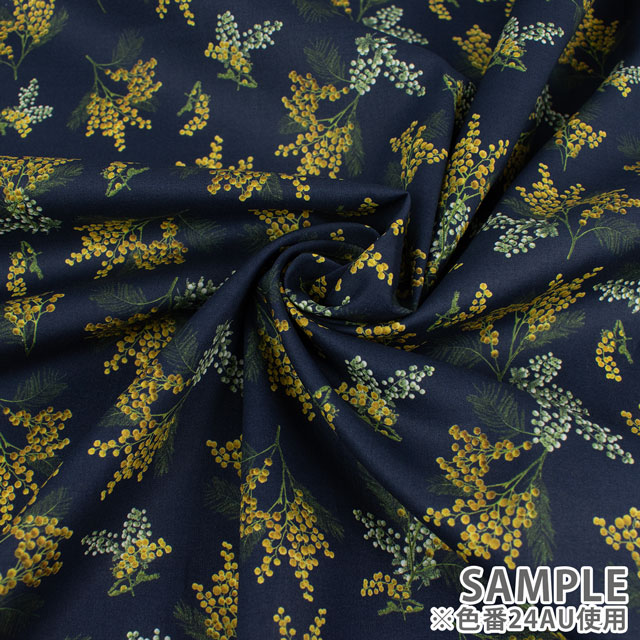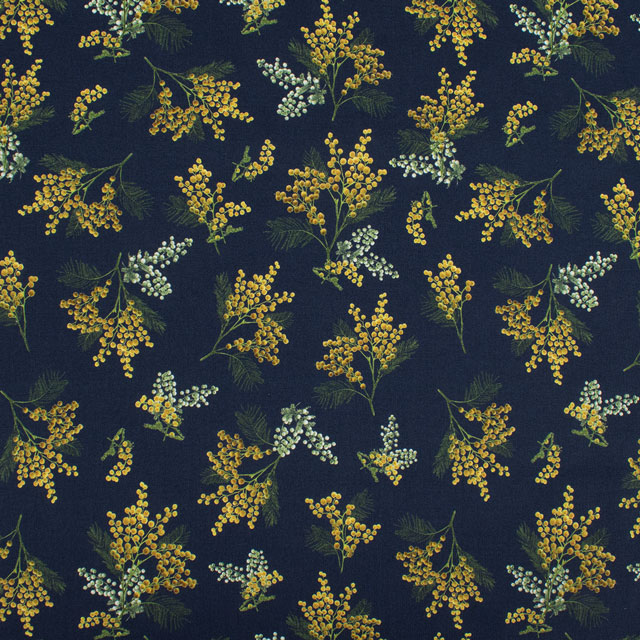 無数の小さな丸い花と羽のような葉が、そよ風に揺られながら生地の上を優雅に舞っているように見えます。