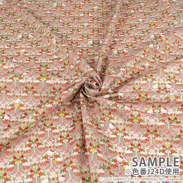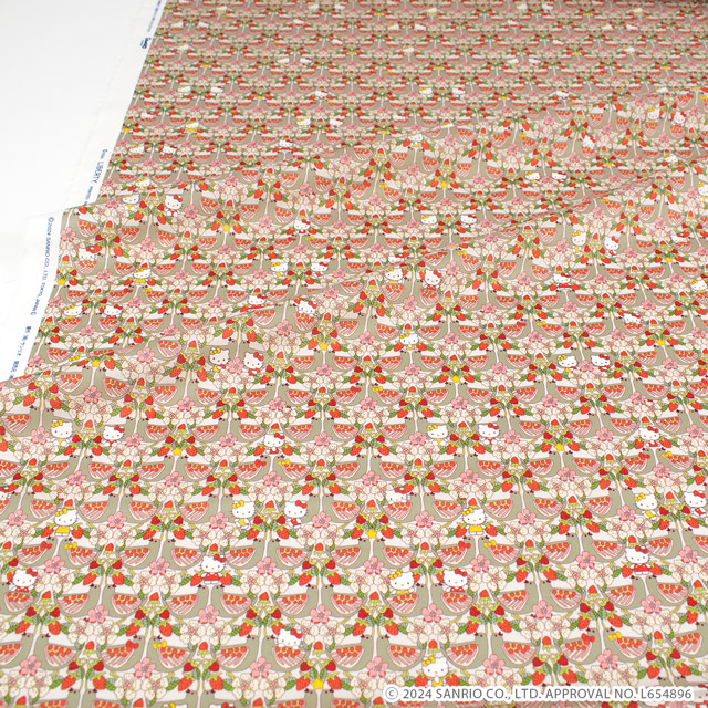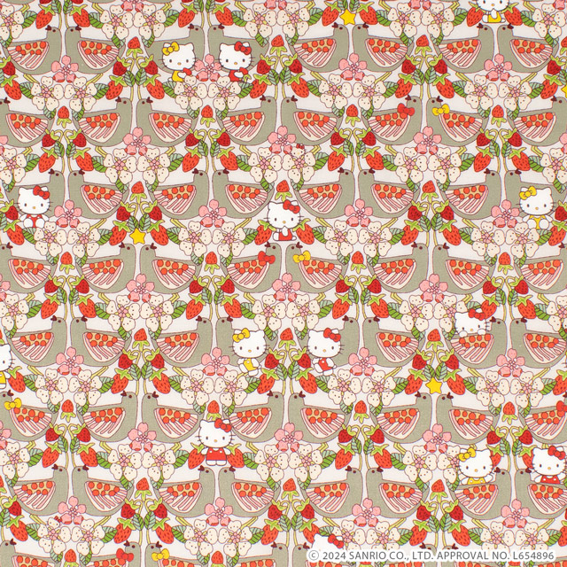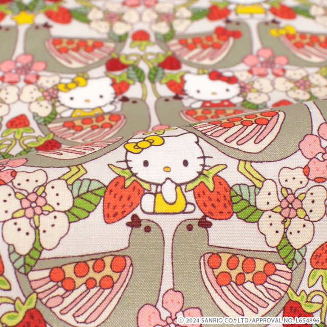 よく見ると、優雅な鳥たちが鏡面レイアウトされた中に、花が咲き誇る枝とジューシーなイチゴに囲まれた可愛いハローキティのキャラクターが隠れています。