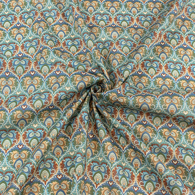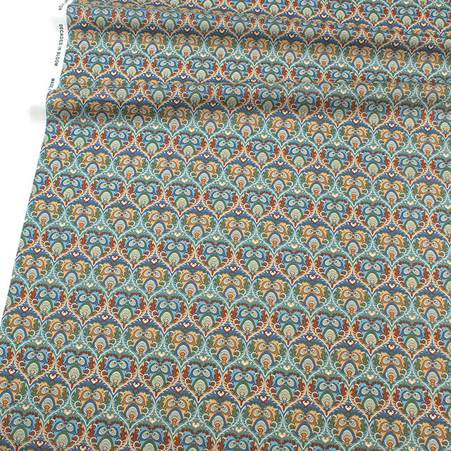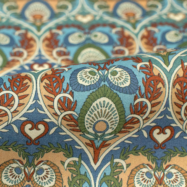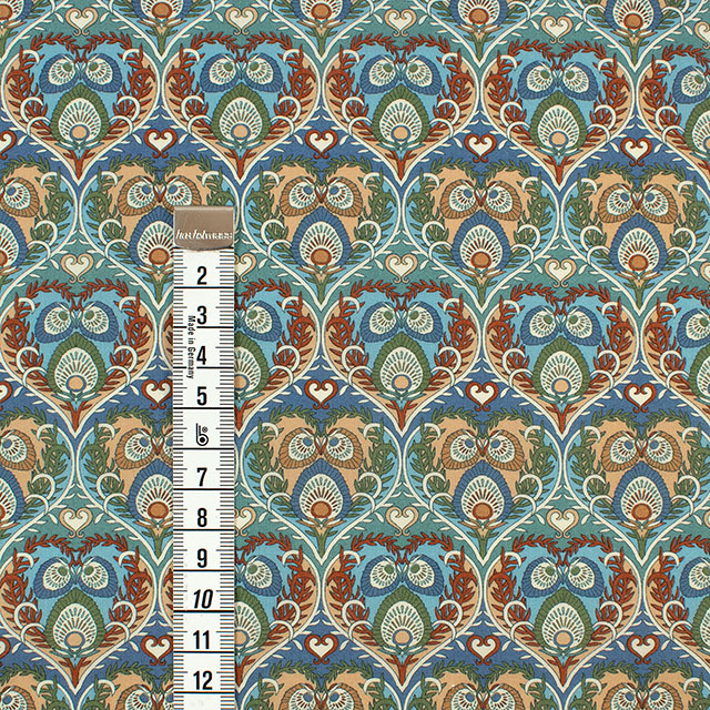 リバティ・スタジオで手描きされたこのパターンは、波打つような動きが整然としたオージー模様を形成し、伸びやかな葉の茎が繊細なハート形へと優雅に広がっていきます。